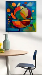 Obwohl das ursprüngliche Kunstwerk keine direkte Verbindung zur Musik aufweist, kann seine Ästhetik als Inspiration für die Technokunst dienen. Die dynamischen Formen und kräftigen Farben erinnern an die pulsierenden Rhythmen und visuellen Eindrücke der elektronischen Musikszene. Künstler könnten diese visuellen Elemente nutzen, um immersive audiovisuelle Erlebnisse zu schaffen, die die Energie und Bewegung der Technokunst widerspiegeln.