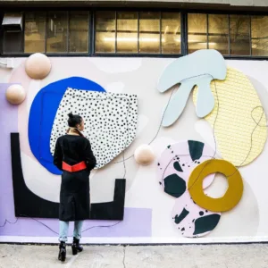 - Ein Mixed-Media-Werk, das Fotografien von Menschen in Noppenfolie mit Malerei kombiniert, um die Entfremdung in der modernen Gesellschaft zu thematisieren.
