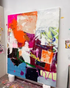 Die Farbpalette umfasst kräftige Töne, die miteinander verschmelzen und dabei neue Nuancen und Schattierungen erzeugen. Diese Mischung aus Farben und Formen erinnert an die fließenden Bewegungen von Flüssigkeiten und vermittelt ein Gefühl von Freiheit und Ungebundenheit. Die Komposition wirkt spontan und intuitiv, als ob sie den natürlichen Fluss von Farben und Formen einfängt.